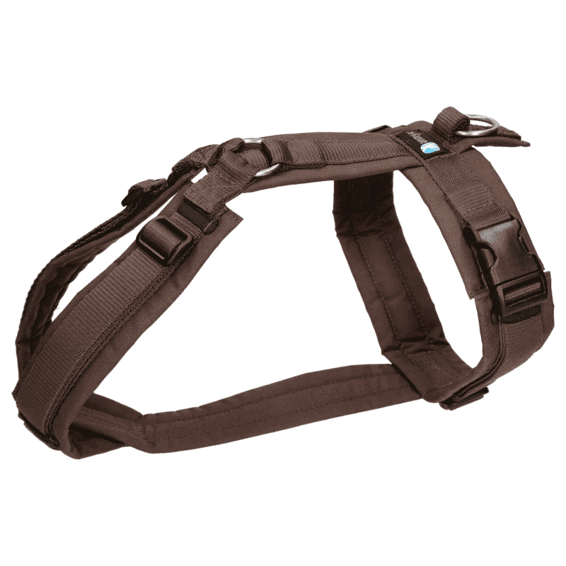 Die umlaufenden Gurte im Brustbereich bilden dank des langen Unterbruststegs einen bewegungsfreundlichen Abstand zu den Vorderbeinen, so dass die Achseln geschont werden. Das Gurtband ist in der kleinsten Einstellung komplett mit luftdurchlässigen Schaumstoff gepolstert und dieser wiederum ist mit Cordura (hoch abriebfestes Material) eingefasst.